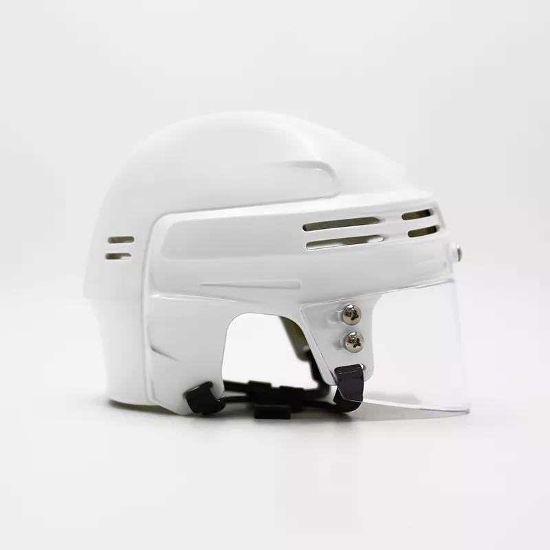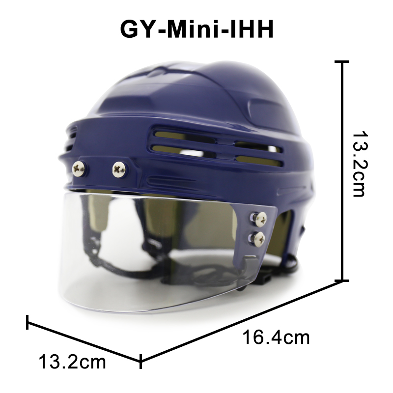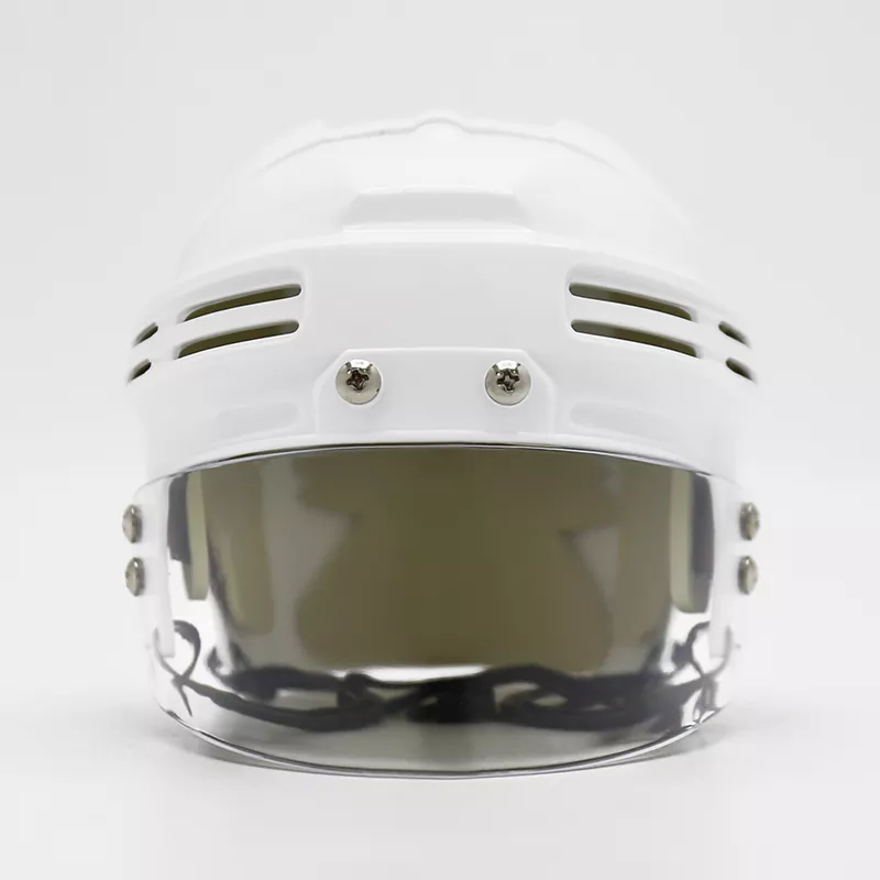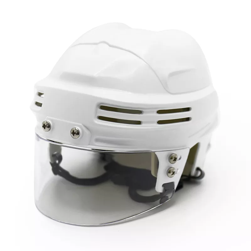 O mini capacete de hóquei no gelo é uma versão reduzida de um capacete padrão de hóquei no gelo, projetado para exibição ou como novidade. Normalmente apresenta os mesmos elementos de design de um capacete de tamanho normal, incluindo um revestimento externo rígido, acolchoamento protetor e uma tira de queixo. O capacete também pode incluir logotipos ou cores de times para representar um time de hóquei específico. Embora não seja destinado ao uso real em jogos, o minicapacete de hóquei no gelo serve como um item divertido e colecionável para os fãs do esporte.
